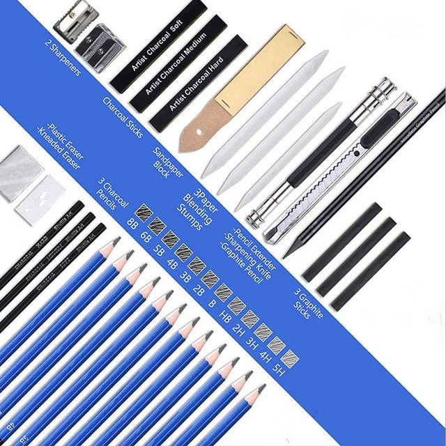 Consists of 12 sketch drawing pencil, 4 charcoal pencil, 3 charcoal rod, 3 graphite stick, 3 paper blending stump, 1 knife, 1 double-headed pencil extender, 1 eraser, 1 kneaded eraser, 1 sharpener, 1 double-hole sharpener, 1 sandpaper block